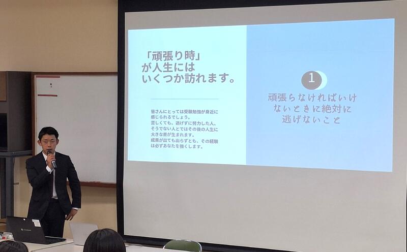 終業式の学校長式辞では、石村校長先生から、高校生が数学を駆使して課題解決を目指す、金沢大学主催の「日本数学A-lympiad(エーリンピアード)」について紹介していただきました。