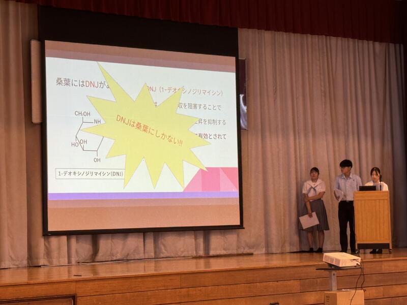 ポスター発表とは研究発表等において見られる発表形式で、自らの研究をA0の大きさのポスター1枚にまとめ、それを壁や衝立に掲示して、立ったまま参加者に説明をするというものです。今回は研究発表5分、質疑応答5分の計10分を1ターンとして、計3ターンを各発表者が行うという形式で行われました。本校から参加した3名は、カゼインプラスチックを柿渋で強化することができるのではないかという研究テーマに取り組んでおり、発表を聞かれた大学の先生方から多くのアドバイスをいただいていました。このように他の人(特に大学の先生など)の前で発表をするというのは、人間的にも、課題研究的にも大きく飛躍できる機会となります。研究自体はまだ拙いものですが、今回の発表でも質疑応答にしっかりと受け答えできており、自分たちで試行錯誤しながら取り組んできた成果を発揮していました。