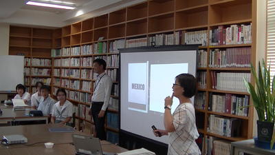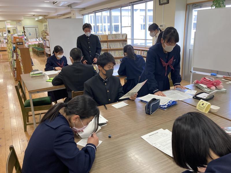 令和元年(2019年)7月8日(月)6〜7限目に本校図書館にて、みらい創造科グローバル探究コース1年「英語探究」の公開授業を実施しました。今回の授業は、生徒たちが参加するイングリッシュ・キャンプで交流するアジアやアフリカからの留学生それぞれの出身国について調べて、それを英語で発表するという3回のプログラムの中の最終回。生徒たちはグループごとに調べたことをポスターにまとめ、英語で発表しました。