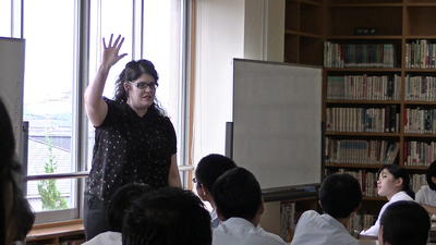 ドラマ指導の手法を使ったウォームアップアクティビティを指導するクリスティーナ・バッキ外国語指導助手 |