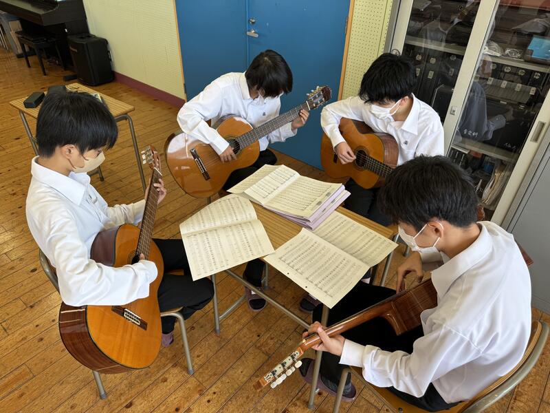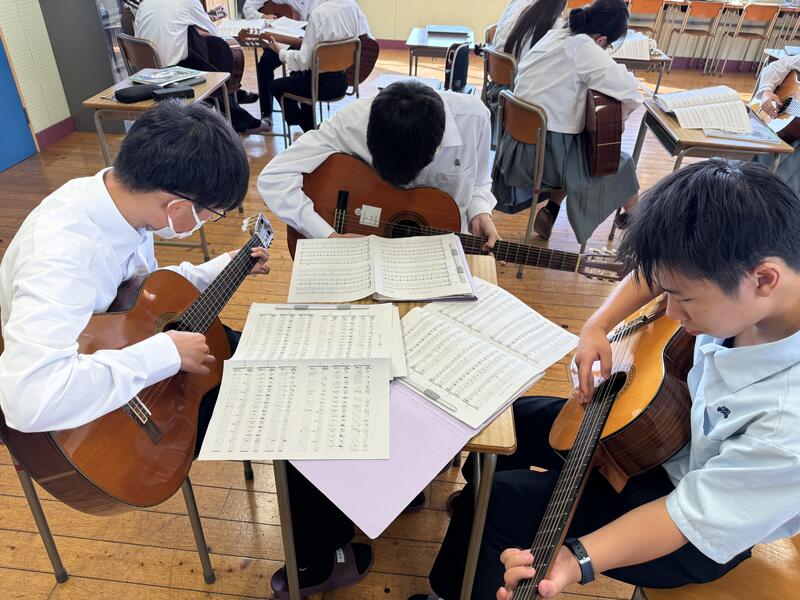 個人で黙々と練習したり、グループで教え合ったりと、様々な形でギターに向かい合っています。