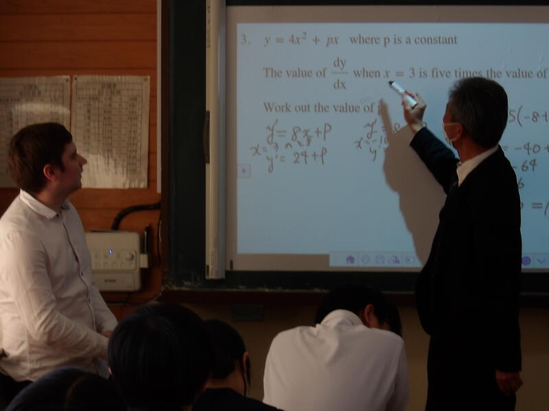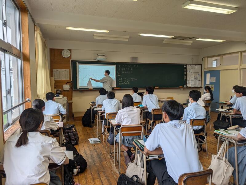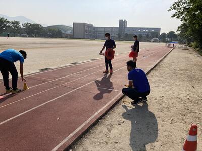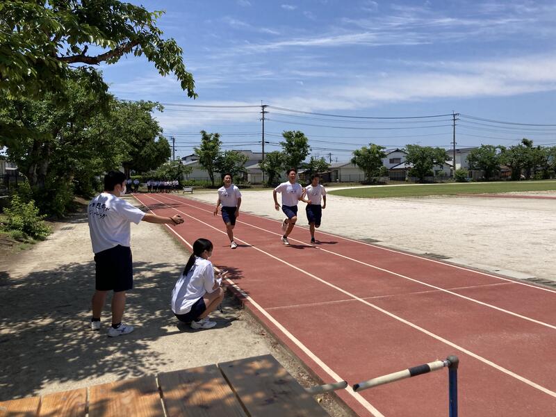 宮崎教諭の数学探究の時間に数学的な視点からバトンパスをスムーズにつなぐことができるのかを考察する授業が行われた。実際に生徒が走り、速度を計算することでバトンパスの走り出す距離を導き出すものだった。体育の田代教諭の協力で撮影区間の設営が行われ、正確な測定が可能となり授業が展開された。