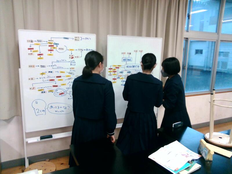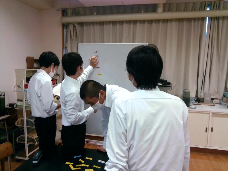 恒常生の単元の復習としてこれまで学んだことを図に示す、班活動を行いました。ホルモンや神経、各器官の書かれたカード使用して図を作成していきます。開始直後から互いに意見を出し合い、活発に活動が始まりました。互いの意見がぶつかる場面もありましたが、納得する形に収まる様子を見てとてもおもしろかったです。