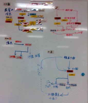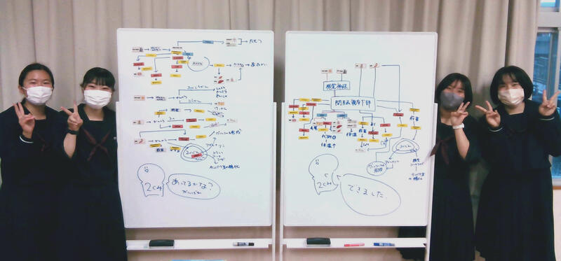 女子グループは外的刺激ごとにまとめていきましたが、男子は各外的刺激をすべて1つのカード(視床下部)に結びつけるなど図にバリエーションがあり作成過程を楽しみました。
