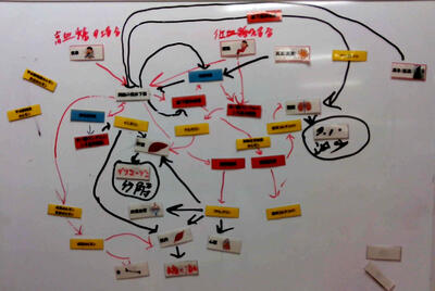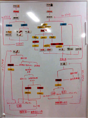 授業時間内に完成しなくても良いと思っていましたが、一つの班が完成させ、他の班も見て来ることを促したり、各刺激でまとめた図の全てに共通するカードが何か考えさせたりすると、もう一度作り直したいと2枚目のホワイトボードに図を作り始めました。チャイムが鳴っても続けたため終礼に間に合わなかったことは反省しています。しかし、終礼後も生物室に来て図を完成させて帰っていった生徒たちはとても満足そうでした。