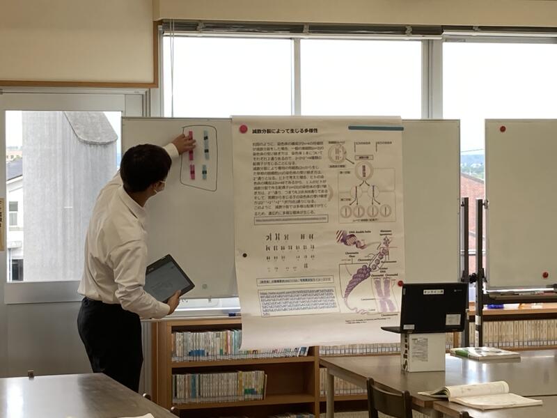 専門の生物では2周間に1度発表会を行っています。各班で決められた範囲の内容を調べまとめてポスターを作り、内容の説明を行います。毎回、ポスター+αを課しています。今回は聞いていいる人がわかりやすくなる教材を必ず作ると言うものでした。各班、ポスター以外に模式図や紙芝居、模型を作る班もありました。問題を丸々出題し解説しながら内容を説明するなど工夫が見られとても関心しました。