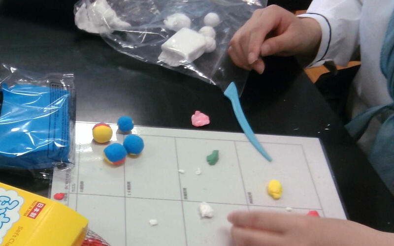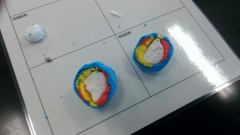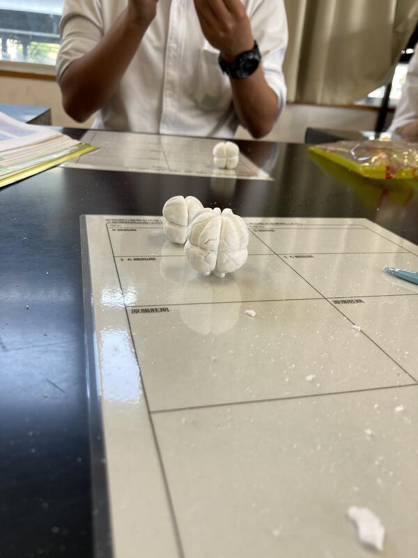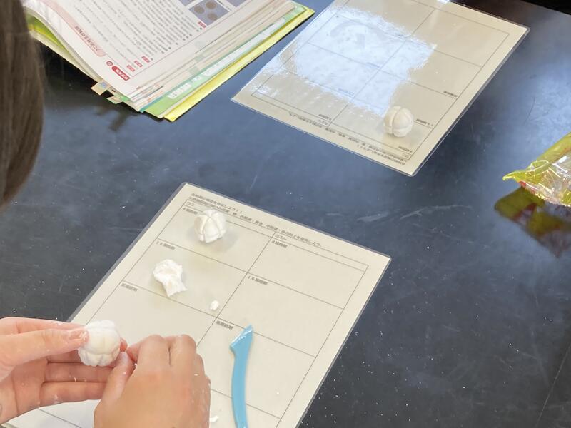 現在、生物の授業で動物の発生の授業を行っています。教科書では発生の様子を写真や断面図で教えてくれていますが、なかなか立体的にイメージすることができません。そこで、彫刻など立体的に制作する美術の知識を使えないかと考え粘土による模型作成を実施しました。模型作成にあたり、本校の美術の松本教諭に授業をしてもらい、立体的に制作する方法やコツを習いました。