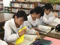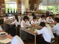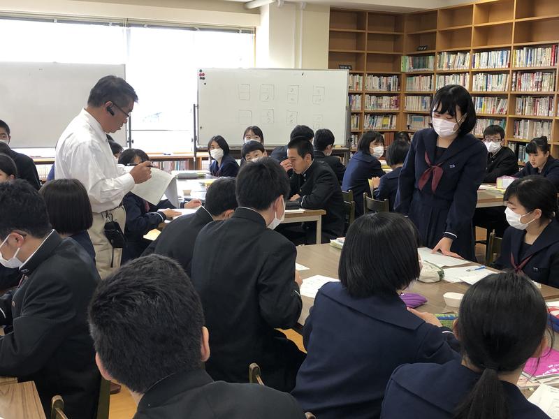 写真は図書館で行われた3年4組の授業。生徒たちは、研究の手法として、新書や論文の読み方と、活用の仕方を学んでいました。指導は3学年の総合的な学習を計画する冨田枝里教諭。「新書の読み方~4つの視点~」「論文の引用・参考文献の記載の仕方」などワークシートや資料を豊富に準備して、生徒の論文作成に向けて、ステップバイステップでの指導が行われていました。