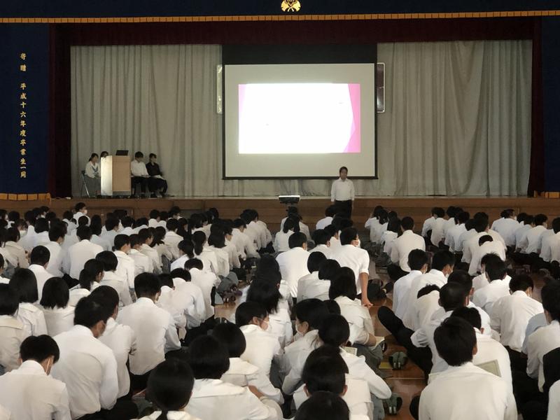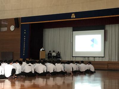 1時間目には校長講話を実施しました。これからのSociety5.0の社会を担う若者に求められる資質や能力について、また生徒たちに期待することについて、瀬口和弘校長自身がその思いを直接生徒たちに伝えました。2時間目には「生徒募集」「防災」「生徒会活動」の3つのテーマを担当する教諭から、それぞれのテーマについて、本校の現状と課題についての講話を行いました。生徒たちもそれぞれの先生方の話を真剣に聞き入っていました。