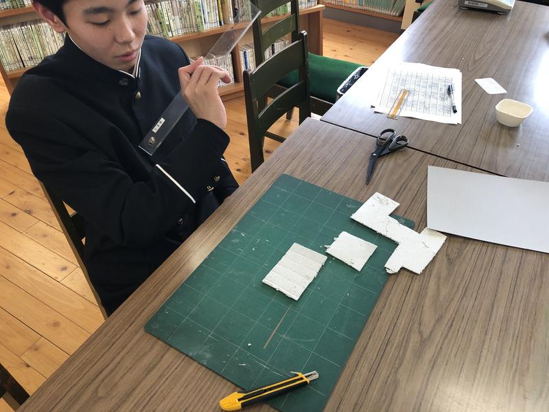 あるグループは柿渋(タンニン)を使用してプラスチックの代わりにならないかとシュレッダー後の紙を溶かし板状にし、柿渋をしみこませた物とそうでない物の耐久性を比較しようとしています。