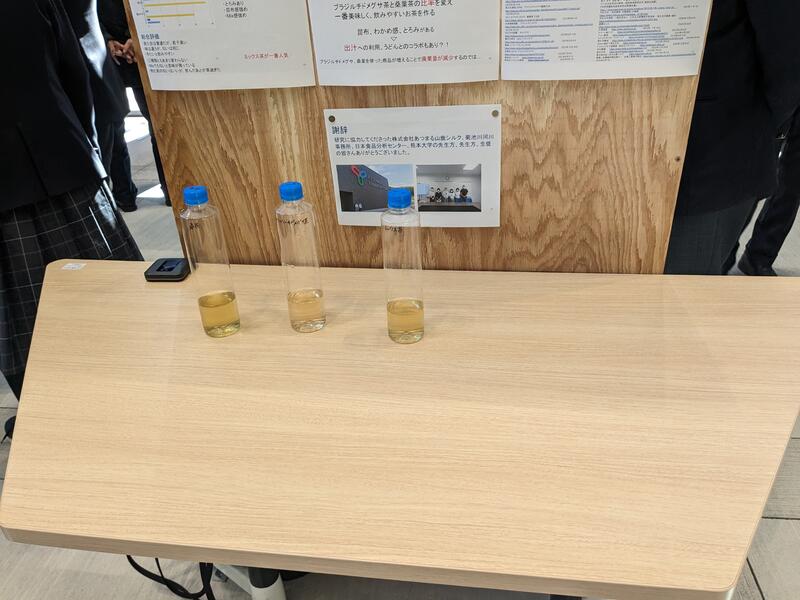 タイトルは「山鹿原産オリジナルティー」。特定外来種のブラジルチドメグサと桑葉の効能を生かした健康茶を作る研究です。右の写真は、作製したブラジルチドメグサ茶、桑茶、ブレンド茶です。