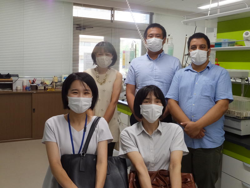 新設された産業イノベーションラボラトリー内にある機器分析学の和田 美貴代特任准教授(写真後列左)、デブコタ ハリ特任助教授(写真後列右)、河原 哲平 特任准教授、薬草園技術職員の渡邊 将人様(写真後列中央、本校平成16年卒)を訪問してきました。