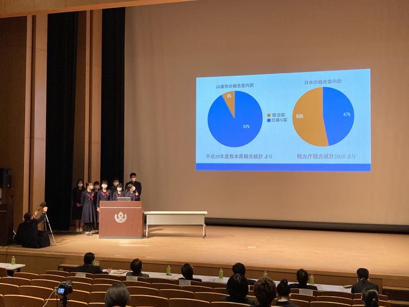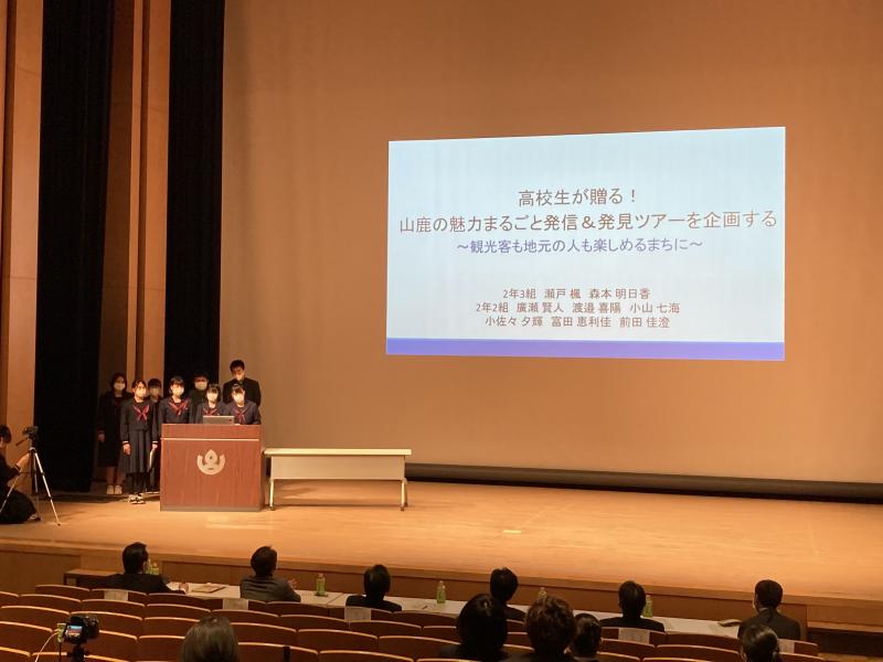 山鹿、菊池、玉名地区の8校の代表が集い、菊池川流域を元気にする提案や取り組みをプレゼンしました。本校からは二年生が『高校生が贈る!山鹿の魅力まるごと発信&発見ツアー企画による山鹿市の観光振興への提案』というタイトルで発表を行いました。発表後は多くの質問をもらうなど審査員の興味を引いたようでした。