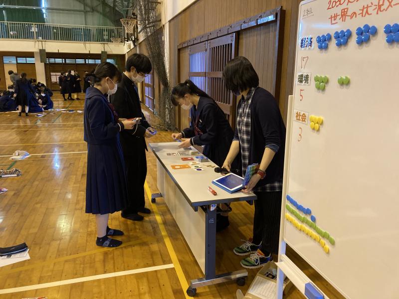 持続可能な開発目標(SDG’s)について学習を行いました。これまでコロナ禍から見えてきた社会課題と班の興味関心を結びつけ課題研究を進めてきました。2年生になる前に世界ではどのような課題があり、どのように取り組もうとしているのかについて学ぶためにSDG’s Association 熊本から講師をお招きしてSDG'sについて講演とSDG’sカードゲームを実施していただきました。多くの生徒がSDG’sがどのようなものであるのかやカードゲームを通して目標達成のためには周りとコミュニケーションを取り協力することや世界がどんな状態にあるのかを逐一確認することの大切さを感じたようです。