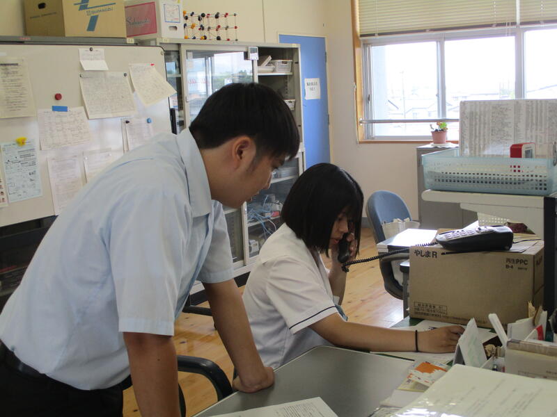 菊池川の水質調査を行っている生徒は電話でインタビューを依頼。