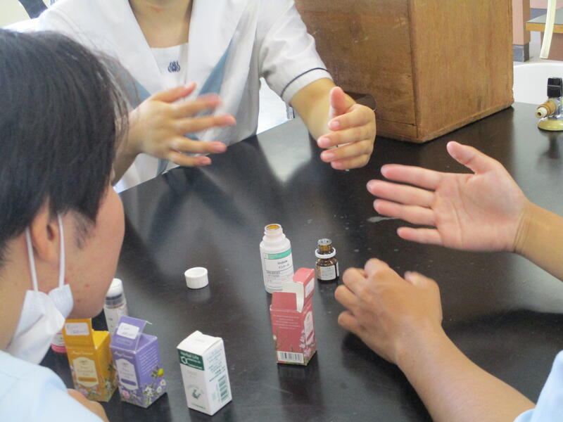 堆肥の臭いを消す研究を行っている生徒は、アロマの香りで堆肥の臭いがどう変化するか、協力者と共に官能評価。