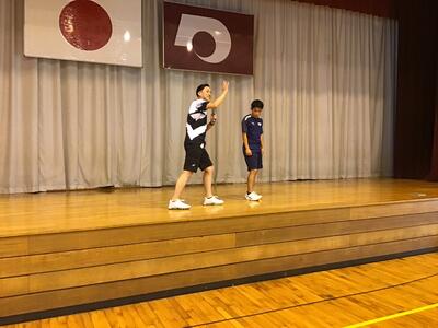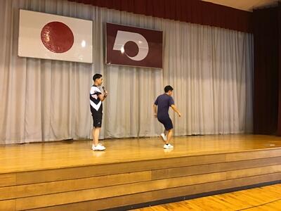 はじめはアスリートでも、うまくステップがができていないことにフォーカスするためにその場でステップを踏んだところから円を描いたりして、ステップの違いや走るイメージすることを説明してもらいました。次に、アジリティーにフォーカスして5人組のトレーニングの紹介などが行われました。生徒たちは、楽しみながら体の使い方を意識していました。