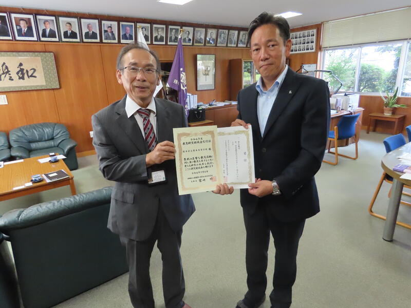 本年度、日本教育公務員弘済会熊本支部から本校へ教育研究助成金をいただきました。交付式では、弘済会熊本支部参事の前田三千治様から本校の石村校長へ、助成金の目録を授与していただきました。いただいた助成金については、今年度の教育活動において、大事に活用させていただきます。