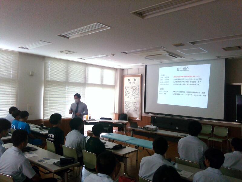 高大連携講座 「スポーツ障害・外傷と理学療法士的視点からの対応」として九州看護福祉大学 看護福祉学部リハビリテーション学科の吉里雄伸先生に講義を行っていただきました。導入では、理学療法士の役割について話をしていただき、足関節捻挫やジャンパー膝、シンスプリントなど高校生で起きる可能性が高い怪我について学ぶことができました。