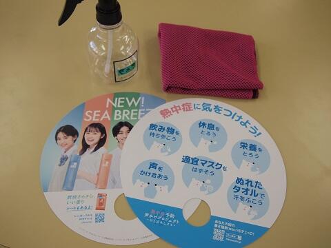 今年は「熱中症予防声かけプロジェクト事務局」からいただいたうちわを配布