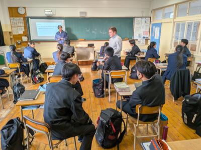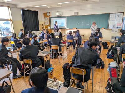 1つの共通したテーマをもとに、複数の教科でそのテーマに関連した内容の授業を行う「テーマクロス授業」に取り組んでいます。同じテーマについて各教科で学習することで、それぞれの教科の見方・考え方の関連を見出すことを目的としています。今回のテーマは干支にちなんで「馬」です。まずは英語の授業で、馬肉を食べることを題材に日本とイギリスの文化や国民性の違いについて考えました。更に日本と海外での考え方の違いについて考えました。