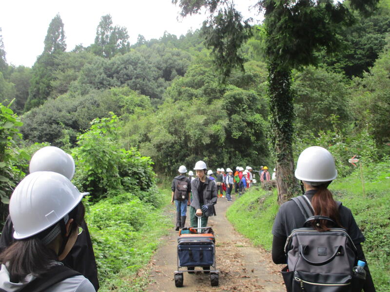 開会式の後,調査を行う和水町山林近くの「ひふみ亭」で、前和水町教育長の岡本様から、「和水町の自然と歴史について」の講話を受けました。その後、嵯峨野高校の生徒さんからレクチャーを受け、ヘルメットやスパッツなどを装着。