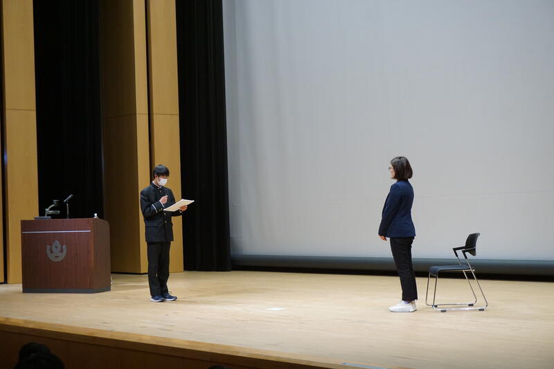 質疑応答では、生徒たちからの「環境悪化を防ぐために大事なことは?」や「研究をする中で特に印象に残っていることは?」など、多くの質問にお答えいただきました。最後に、生徒を代表して2年生の黒田さん(米野岳中出身)から謝辞が述べられました。