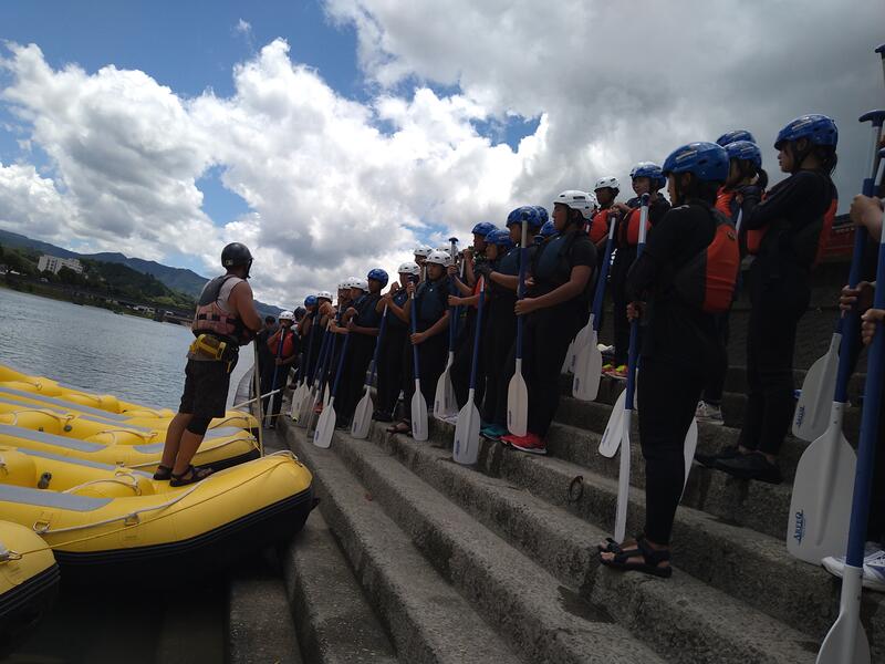 このラフティング実習には、ラフティングを経験することだけではなく、野外活動を楽しませるなどガイドとしての職業観、そして人吉で起きた「令和2年7月豪雨」から学ぶ防災教育を目的としています。