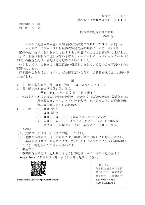 7月12日(金)、本校体育館及び教室にて理数探究YSPⅢ(YSP:山鹿サイエンスプログラム)3年生最終成果発表会を行います。