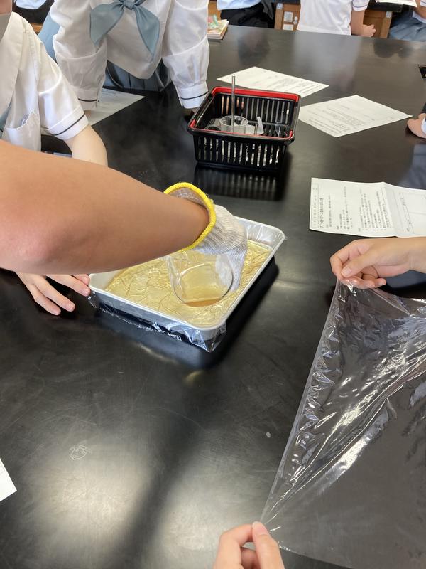 保健の授業で感染症や予防法について学習が行われた。その中で手を洗う効果について菌や細菌を培養する培地を作成し、実際に様々な方法(お湯につけるや2度洗い、エタノール消毒など)で洗った際の手の菌の変化を調べた。
