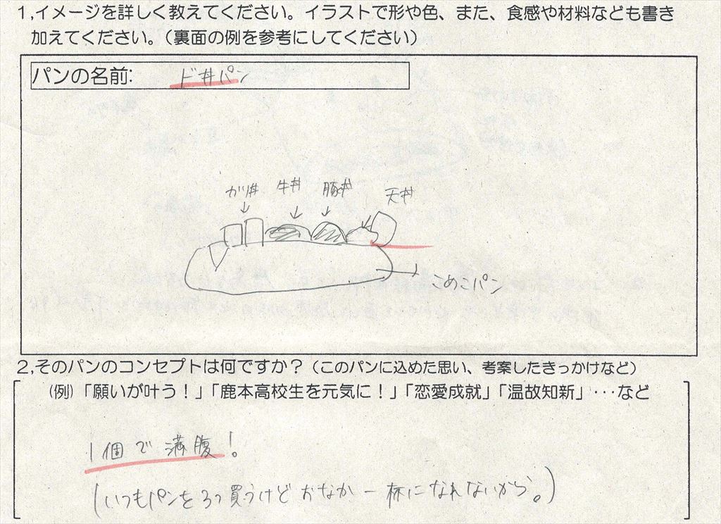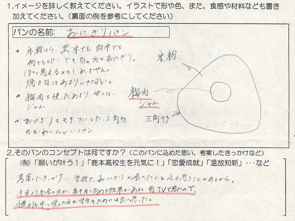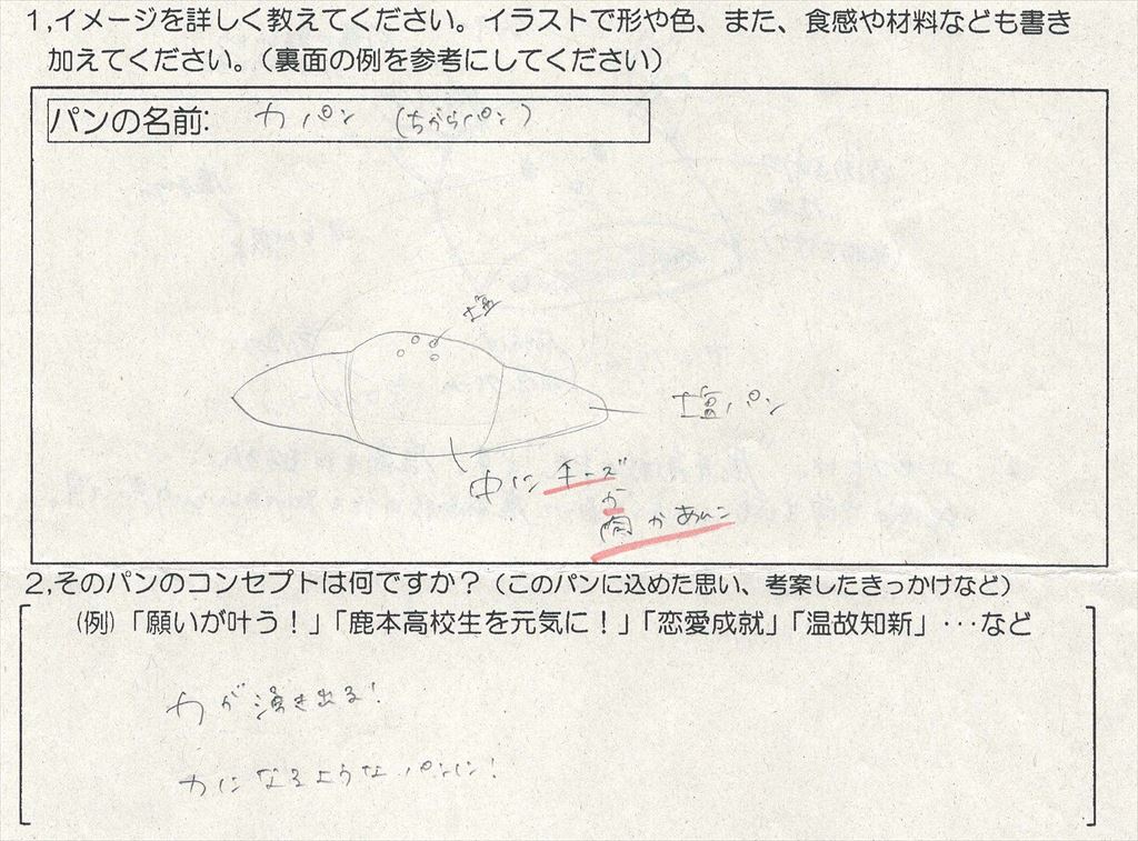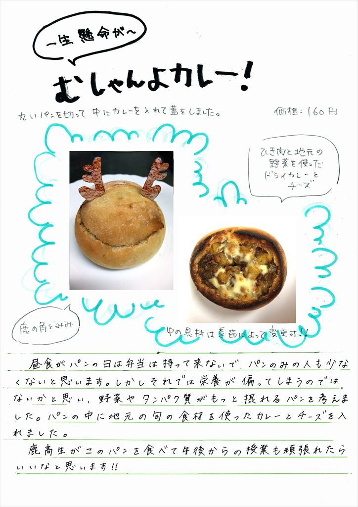 食べ盛りの鹿高生のために考え出された企画もたくさんありました。高永さん(2年)の『ド丼パン』だけでなく、竹田くん(2年)は弁当を忘れた人のために焼きそば、ハンバーグ、チーズをパンに挟んだボリュームのある『伝説パン』を提案してくれました。松尾さん(3年)の『力(ちから)パン』も食べたら頑張れそうなパンですね。和風なところでは、大坂さん(2年)の『おにぎりパン』がどんな味なのか気になります。