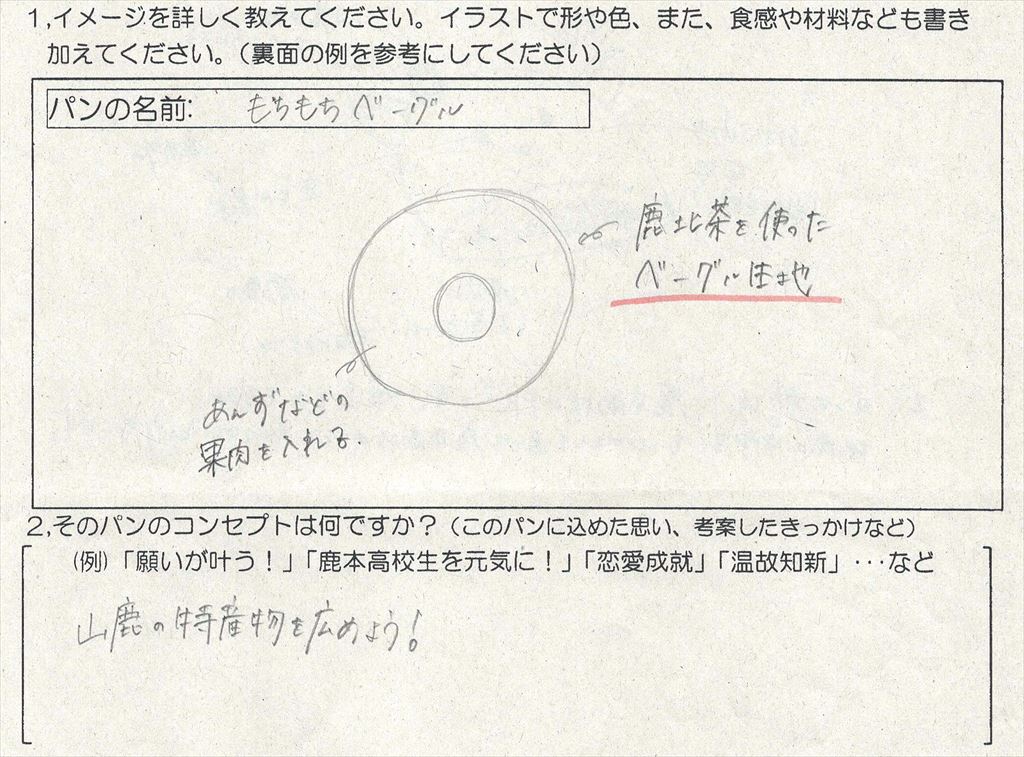 企画で多かったのが、米粉やお茶、果物など地元の食材を使ったパンです。中野さん(2年)は、山鹿の旬の食材を使うなどして鹿高生のやる気が出る4種類の味をシェアできるパンを提案してくれました。永田さん(2年)の『もちもちベーグル』もおいしそうです。