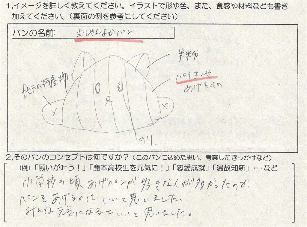 岡山さん(2年)の『むしゃんよかパン』は特産物を使い、米粉パンを使用した揚げパンです。揚げパンとしては林田くん(1年)の『フライパン』のコンセプト「パンを揚げて気分もあげあげ!パンをフライして空に飛び立て!」が楽しそうでした。揚げるパンならば林田さん(2年)の『ピロシキ』も地元食材ふんだんで間違いなくおいしそうです。