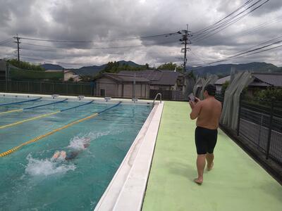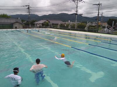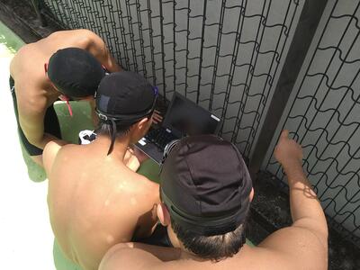 今日は水泳の授業の紹介です。前半はクロールの基本的な動作を学び、後半は4泳法(クロール、平泳ぎ、バタフライ、背泳ぎ)から泳法を選択し、インターネットでポイントを確認して練習方法を学んだり、動画を撮影して泳ぎを確認しペアで教えあったりしました。そして、最後は着衣泳をして、自らの命を守るための方法を考えました。