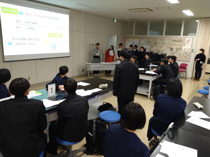 栄養に関する講義「スポーツと栄養」を受け、その後、「アスリートの補食」として様々なレシピの紹介や大学生が作ってくれたおにぎりを試食しました。探究に関するアドバイスも個別に受けることができました。