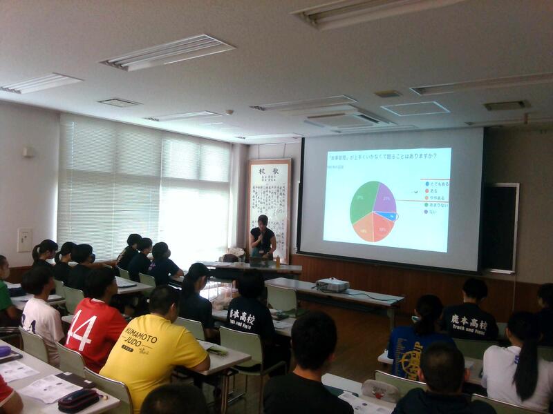 7月3日(水)5,6限目に熊本学園大学より府内先生に来校していただき、スポーツ科学入門として講義を行っていただきました。陸上選手のデータや速筋や遅筋の違い、スポーツを科学的な視点で考えたときの楽しさなど学ぶことができました。トップアスリートを目指す中で、科学的な視点を取り入れながら競技力の向上や進路についても考えさせられる時間でした。