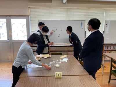 すると・・・会議が終わったあとに、早速、森先生による、SDGsカードゲーム(森先生オリジナル)の指導方法の講習会がはじまりました。先生方も真剣に聞き入り、やってみていました。鹿本高校の先生方は、今年も熱いのです。