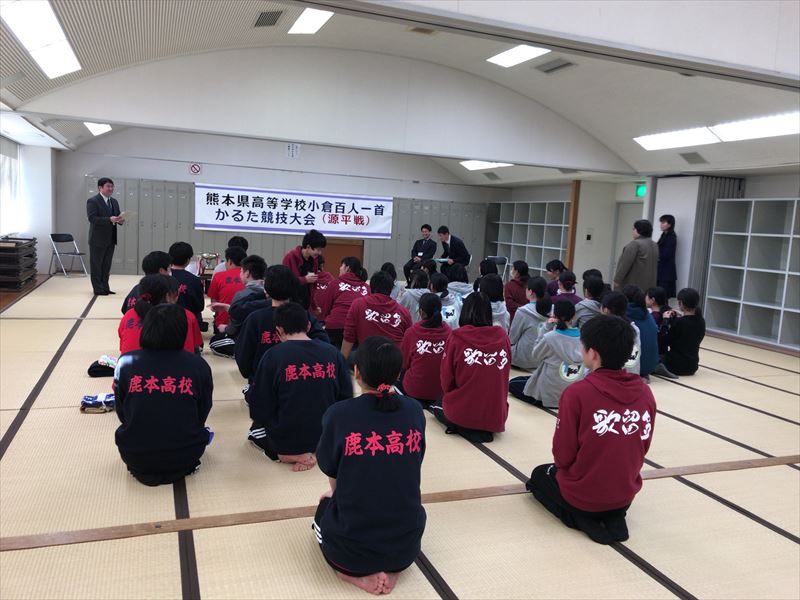 1月27日(土)熊本学園大学西合志研修所で第39回熊本県高等学校小倉百人一首かるた競技大会(源平戦)が行われ、鹿本高校から4チームが1部(部活動・経験者の部)に参加しました。