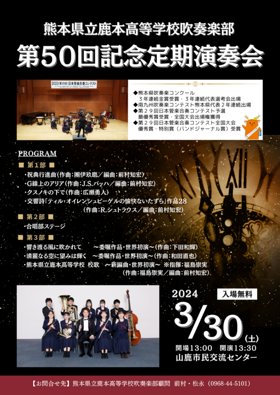 第3部はOB・OGの先輩方と、そして鹿本高校吹奏楽部がお世話になっている演奏者の皆さんと合同演奏ステージを企画しております。