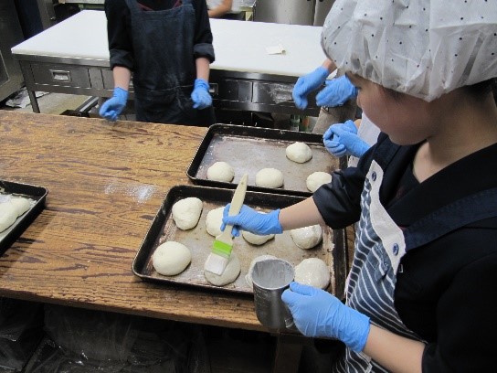ピロシキの具や米粉抹茶クリームは私たち家庭部が学校で作り、それを真生堂さんが準備して下さった生地で包んで焼いていきます。