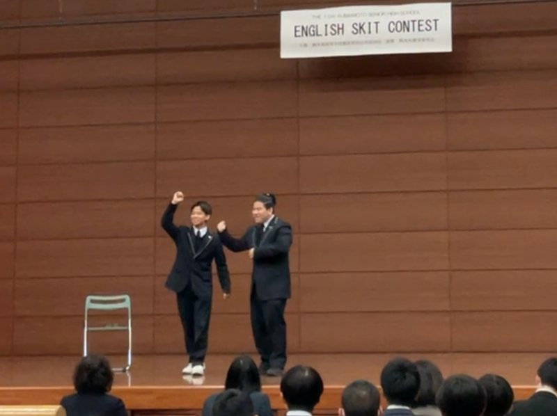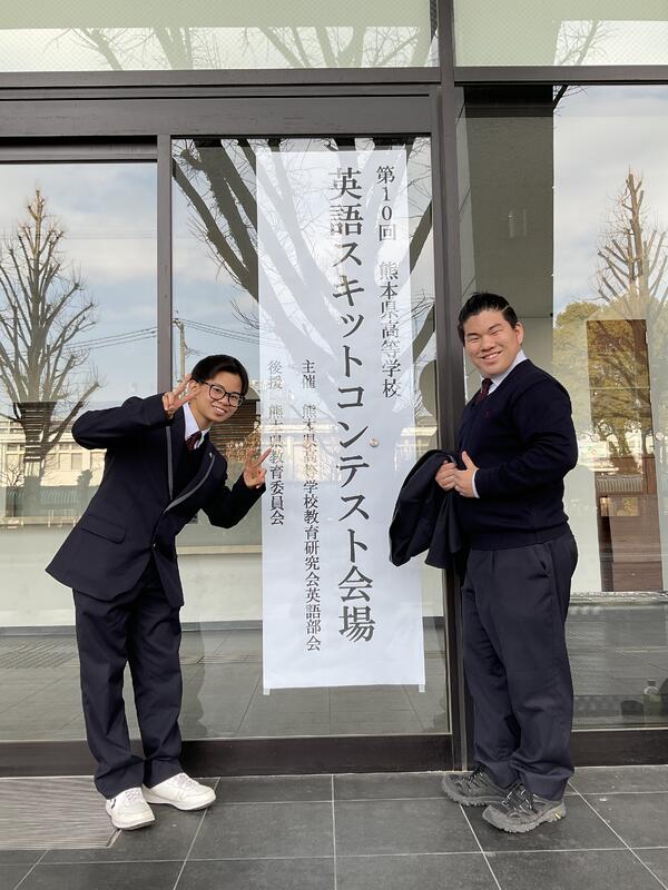 1年の水上くんと渡辺くんが、1月24日(土)に開催された第10回熊本県高等学校英語スキットコンテストに出場しました。県内からは13チームの出場があり、どのチームも練習を重ねた様子がうかがえ、素晴らしい内容と演技でした。とても興味深く、笑いあり、感動ありで会場が大いに盛り上がりました。2人は受賞まではいきませんでしたが、ほとんどのチームが3人出場の中、2人で3人分の演技をし、大健闘でした。審査員の皆さんからもお褒めの言葉をいただき、来年の出場を誓いました。
