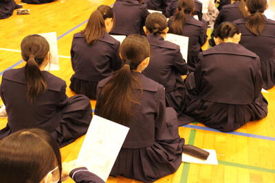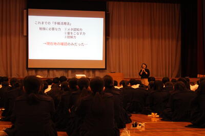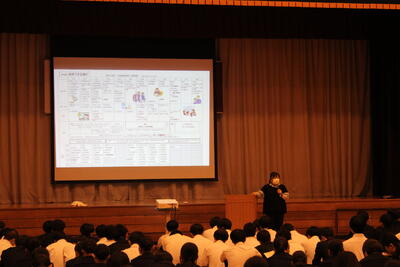 受験や就職活動に向けた心構え、予定の把握から逆算すること、家庭学習時間の確保について、進路指導部の先生からの話を聞きました。
