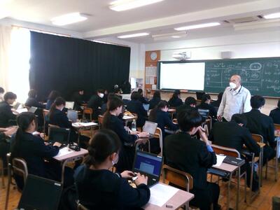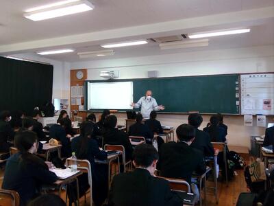 2月26日(木)、2年3組の「英語コミュニケーションⅡ」の時間に、テーマクロス授業が行われました。