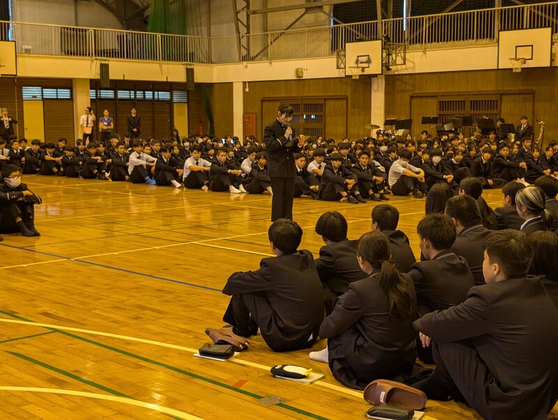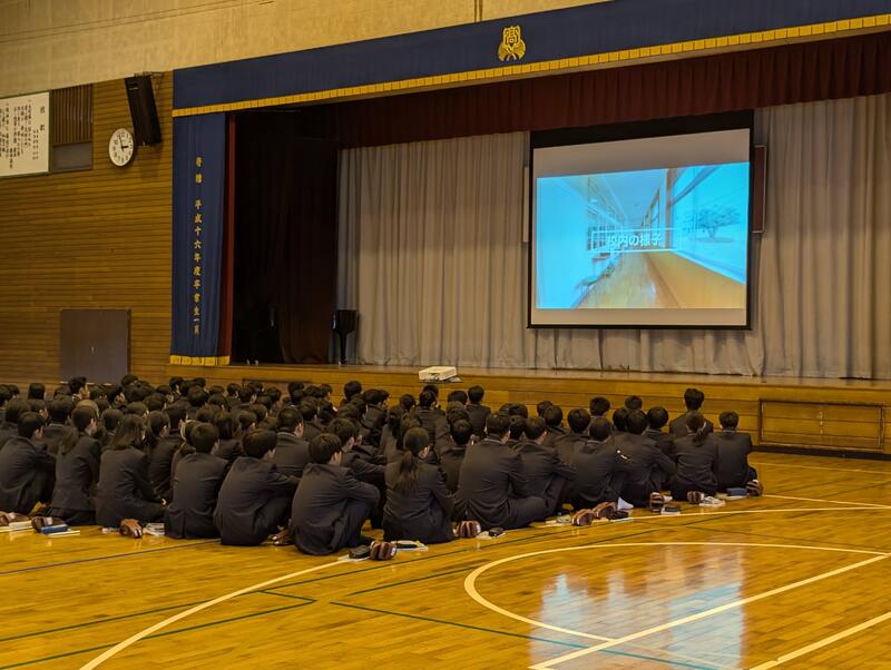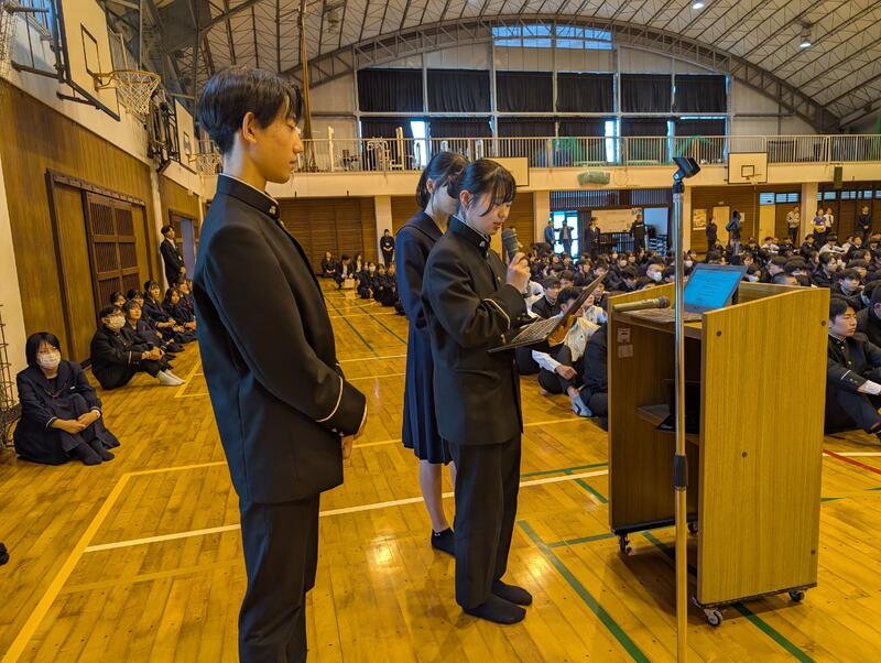 「学校紹介」「部活動紹介」のムービーを上映し、山鹿地区防犯協会さんからの記念品として防犯ブザーをいただきました。