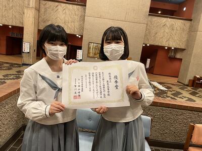 (吹奏楽部を支えてくれた2人の3年生が表彰式に参加しました。)