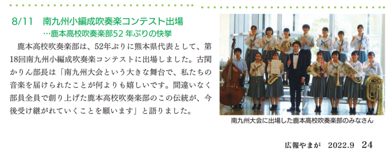【吹奏楽部】「広報やまが」9月号に掲載されました!