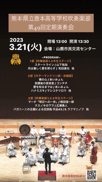 今年度の吹奏楽部の活動の集大成、「熊本県立鹿本高等学校吹奏楽部 第49回定期演奏会」を山鹿市民交流センターにて3月21日(火祝)に開催いたします。