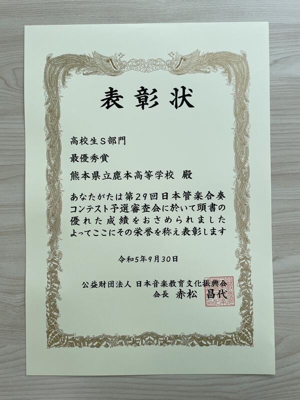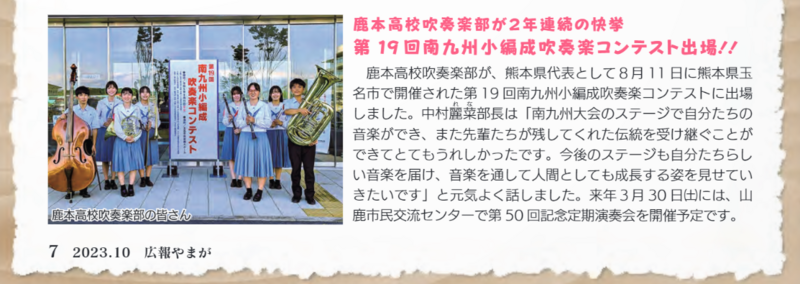 鹿本高等学校吹奏楽部は9月25日~9月29日に実施された予選審査会で最優秀賞を受賞し、第29回 日本管楽合奏コンテスト全国大会へ、鹿本高校吹奏楽部が出場することになりました!(3ページ目の一番最後に載っています。