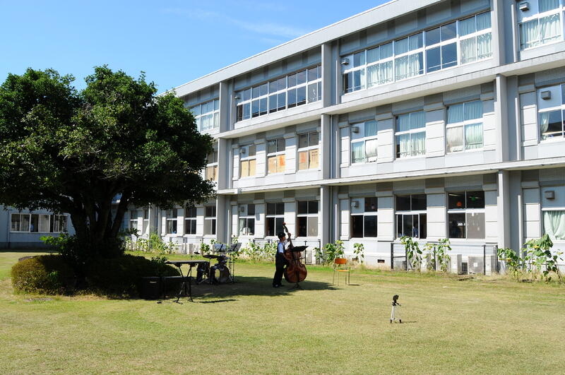 本校吹奏楽部は①コントラバス ⇒ ②テューバ ⇒ ③トロンボーン ⇒ ④フルート・クラリネット ⇒ ⑤顧問(ドラムとサキソフォン)の順で演奏に加わりました。