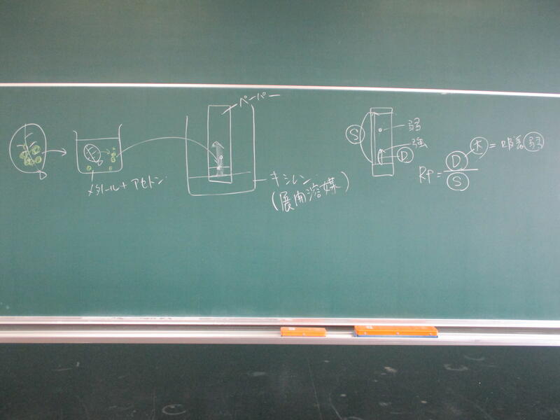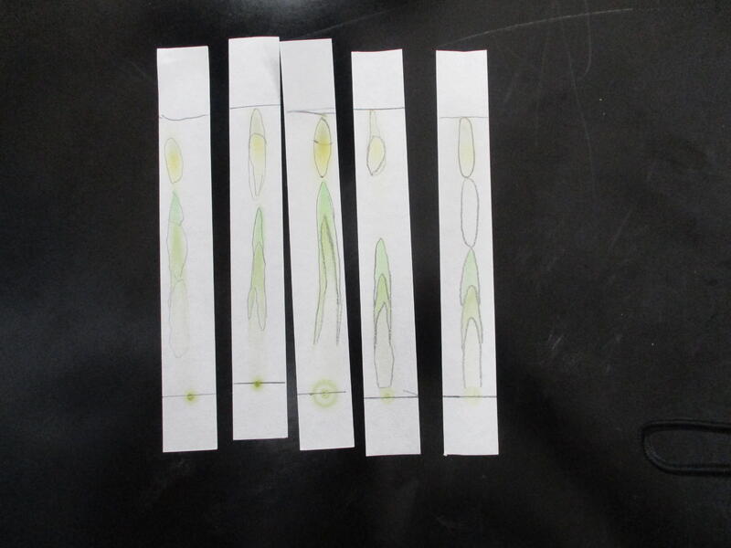 冷凍していたホウレン草の葉を使って、ペーパークロマトグラフィーでホウレン草中の色素を分離しました。